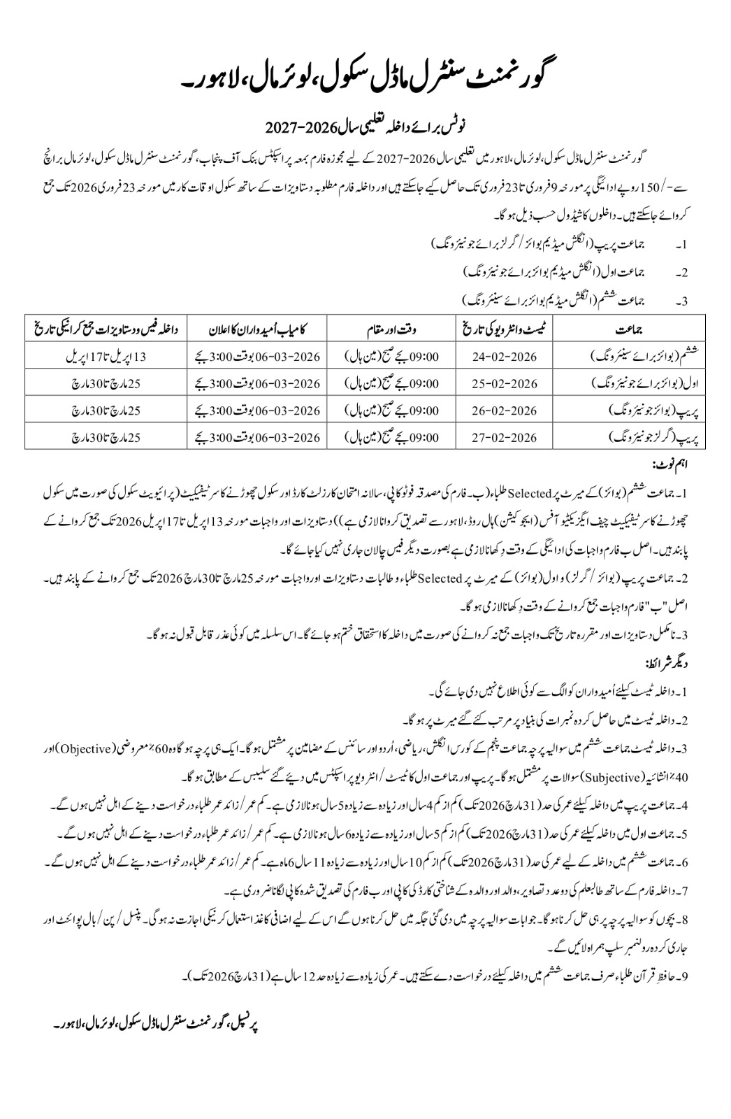 Admission Notice for 2026 - 2027